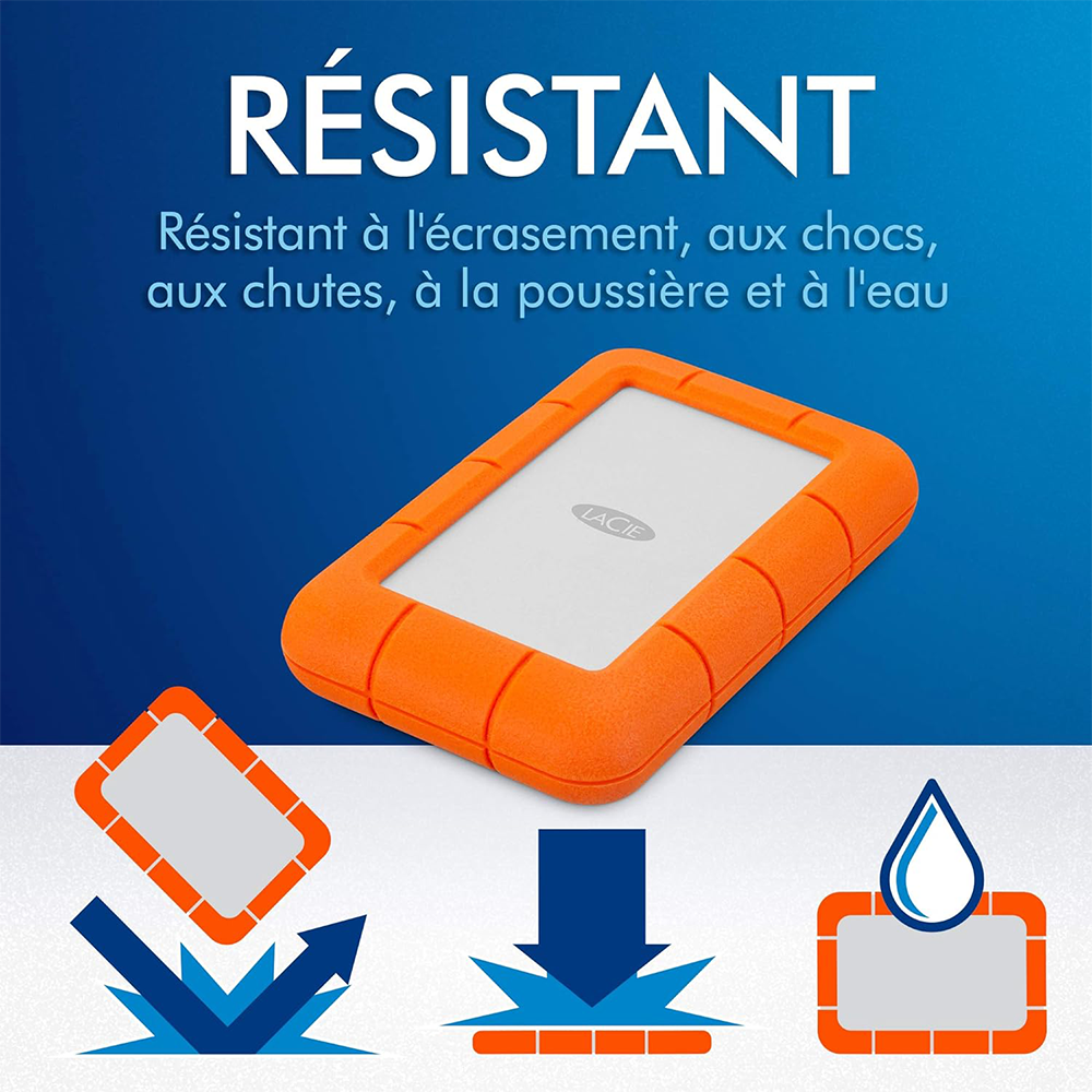 Le LaCie Rugged Mini SSD fait passer vos projets à la vitesse supérieure, qu’il s’agisse de la capture ou de sauvegarde. Grâce à la technologie USB 3.2 Gen 2×2 à 20 Gbit/s, il offre des vitesses de lecture allant jusqu’à 2 000 Mo/s pour des transferts toujours plus fluides et rapides. Sa connectivité Plug & Play avec Mac OS, Windows 10/11, iPadOS et iOS via sa connectique USB-C permet à de nombreux appareils de bénéficier de sa réactivité et de sa capacité de stockage. De plus, sa conception robuste rend le Rugged MIni SSD de LaCie idéal pour un style de vie actif et baroudeur, vous l’emporterez partout.