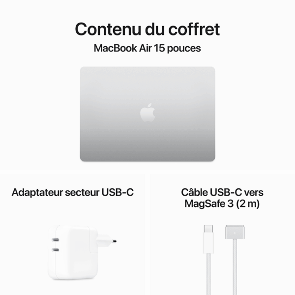 MacBook Air 15 pouces, Puce Apple M3, SSD de 512 Go de stockage, 16 Go de mémoire, Argent, 2024.