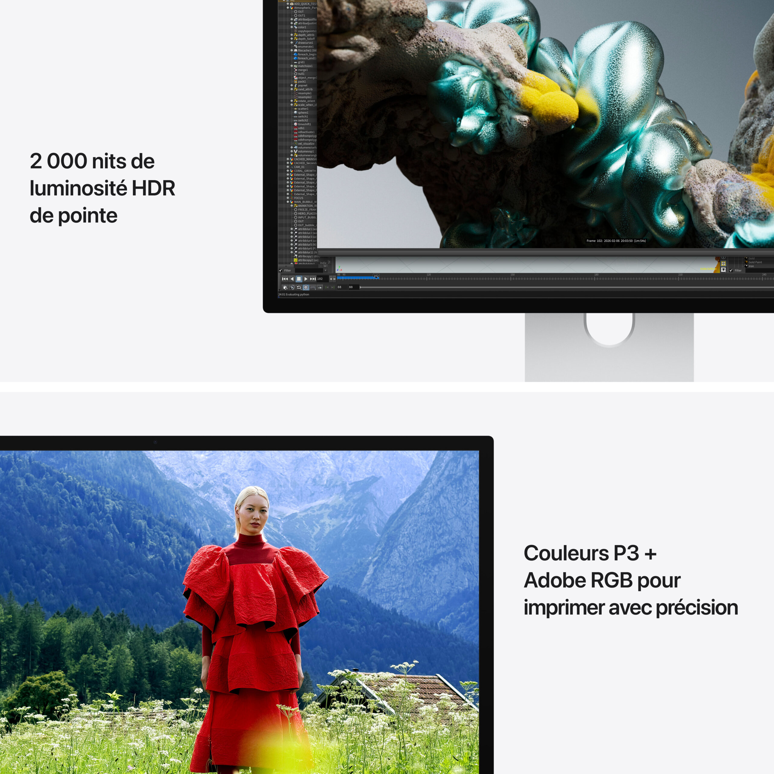 Écran Retina XDR 5K de 27 pouces avec rétroéclairage par mini‑LED. 2 000 nits de luminosité HDR de pointe¹. Large gamme de couleurs P3 et Adobe RGB. Taux de rafraîchissement de 120 Hz et Synchronisation adaptative. Caméra Center Stage 12 MP avec Desk View. Micros et haut-parleurs de qualité studio. Ports Thunderbolt 5.
